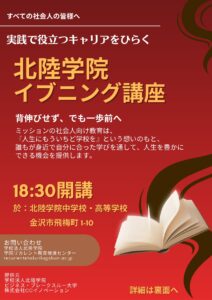 学校法人北陸学院では、「人生にもういちど学校を」という想いのもと、社会人の皆さまを対象とした 「北陸学院イブニング講座」 を開講いたします。